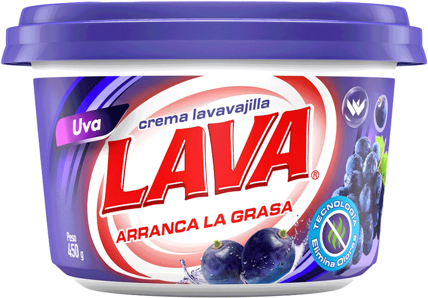 CREMA LAVAVAJILLA LAVA UVA*450GR: Es una crema lavavajilla de color morado con un exquisito aroma a uva. Tiene una fórmula concentrada que rinde más y limpia mejor. Arranca la grasa de forma inmediata, dejando la vajilla y los utensilios de cocina relucientes en una sola pasada. Contiene ingredientes activos biodegradables que se degradan fácilmente en compuestos amigables con el medio ambiente. Se presenta en un envase de 450 gramos.