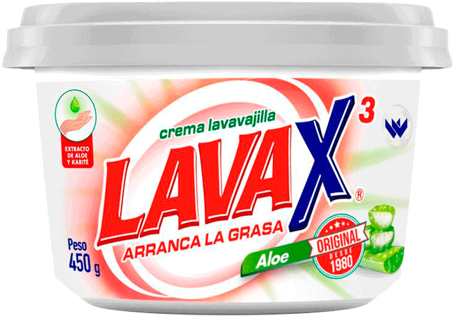 CREMA LAVAVAJILLA LAVAX ALOE*450GR: Es una crema lavavajilla enriquecida con aloe vera que hidrata y suaviza la piel. Tiene una consistencia cremosa de fácil aplicación que brinda un lavado rápido y eficiente. Elimina el 99.9% de bacterias y deja un bonito tono bronceado de aspecto natural en la piel. Se recomienda para tonos de piel claros o medios. Se presenta en un envase de 450 gramos.