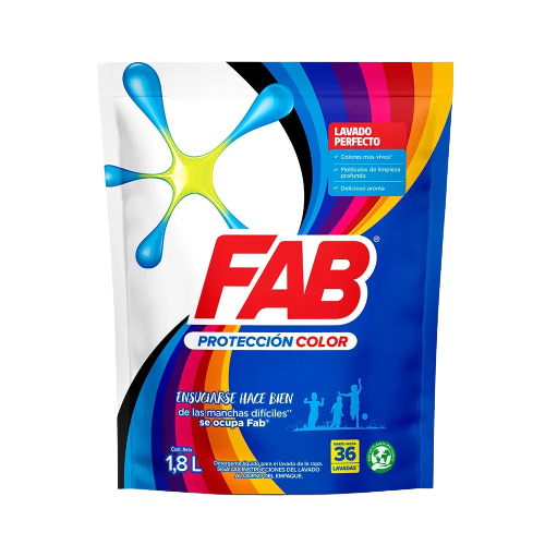 FAB DETERG.LIQUIDO COLOR DOYX1.8L es un producto de limpieza que te ofrece el máximo poder quita manchas y protege los colores de tu ropa. FAB es una marca reconocida y confiable que desde 1963 se ha dedicado a innovar en el mercado de los detergentes.